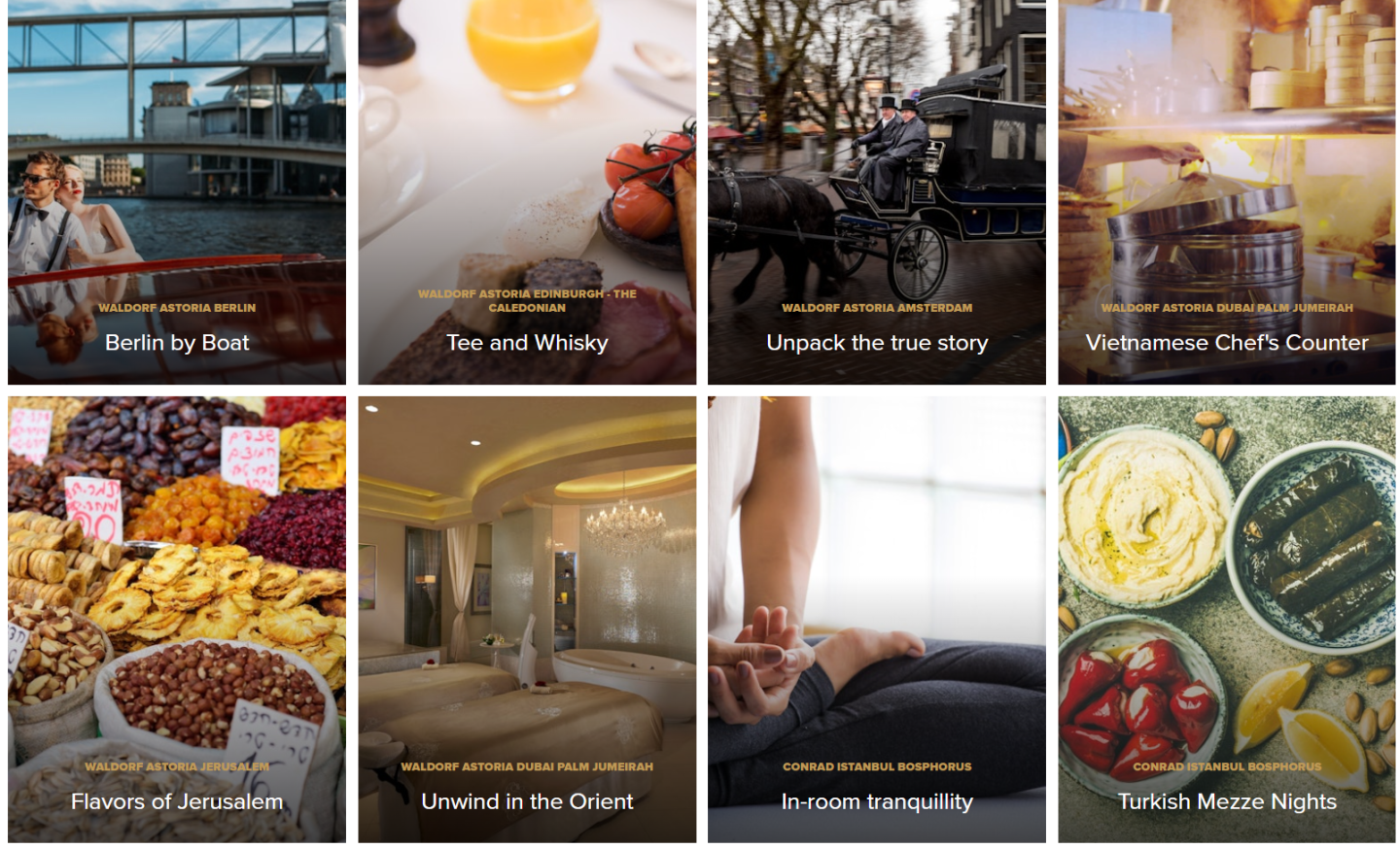 Hilton partners with local providers to offer a slew of arts, culture, culinary and spa/wellness experiences. These options are generally found at higher-end brands like Waldorf Astoria and Conrad.