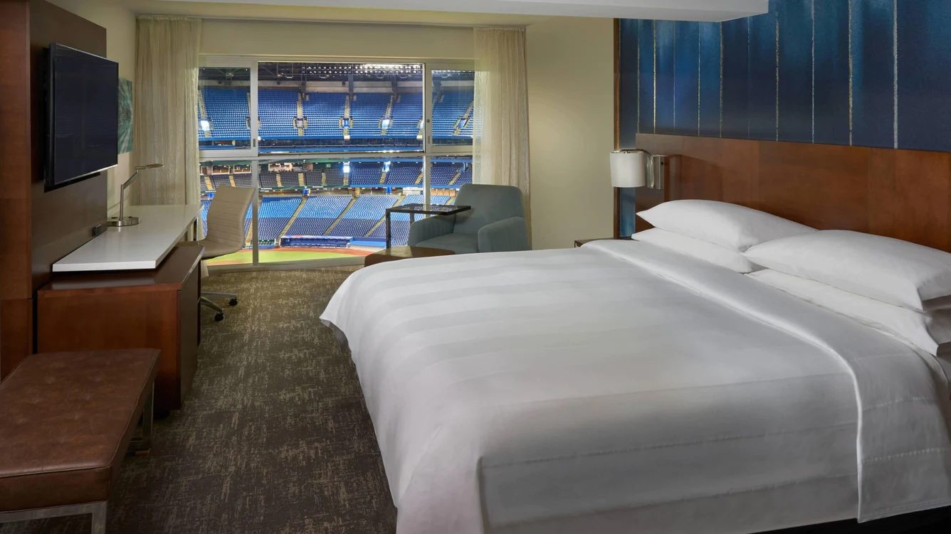 Toronto Marriott City Centre Hotel, located within the Rogers Centre, offers a unique viewing experience for Blue Jays fans. Book one of the field-view guest rooms for floor-to-ceiling windows with panoramic views of the field and stadium.