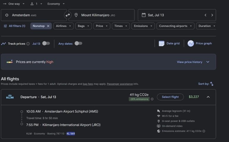 For this flight from Amsterdam to Kilimanjaro, the flight number is KL 569 (highlighted in blue). A downside is that sometimes there are several flights a day between the same cities, so it may be hard to find someone else's complete flight information unless you know the airline or exact departure time.