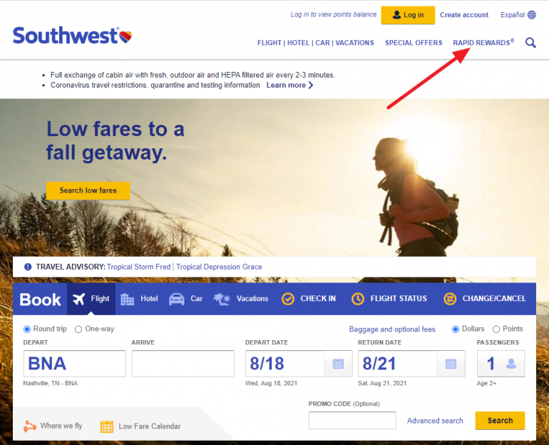 1. Go to southwest.com, log in to your account and click on "Rapid Rewards."