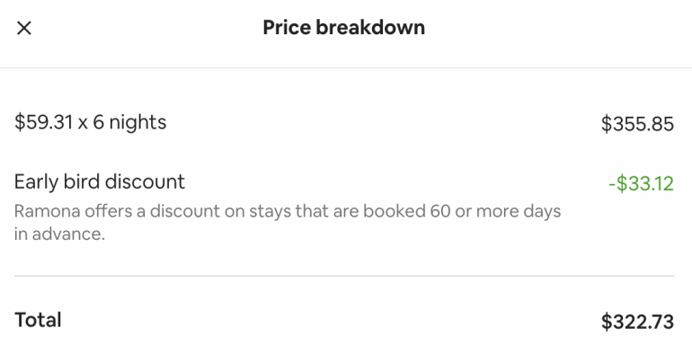 Some hosts attach an early bird discount to their listings. Each host sets their own timeline for how far in advance you have to book to get the early bird discount, but it can be as few as 60 days, so you don’t have to plan your next vacation a year in advance.