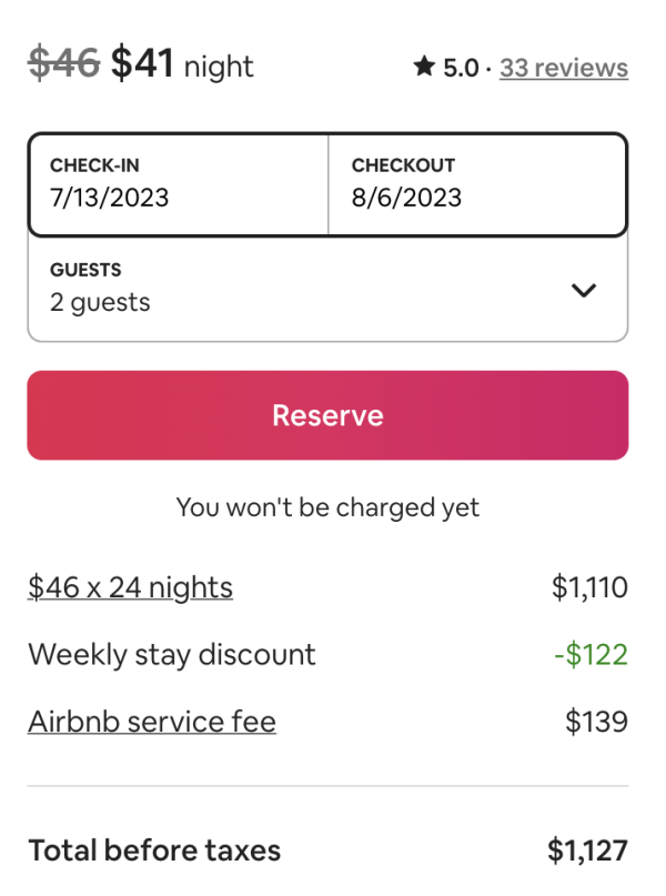 Let’s take a look at an example. We found a 24-night stay at an Airbnb property that costs $1,127.