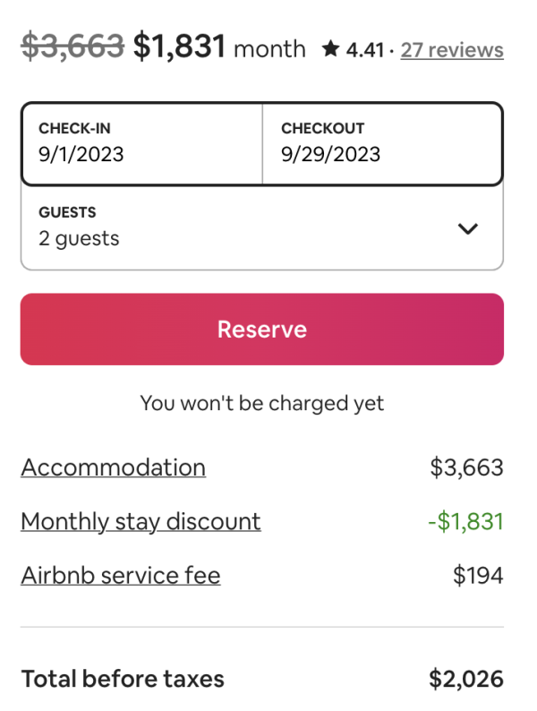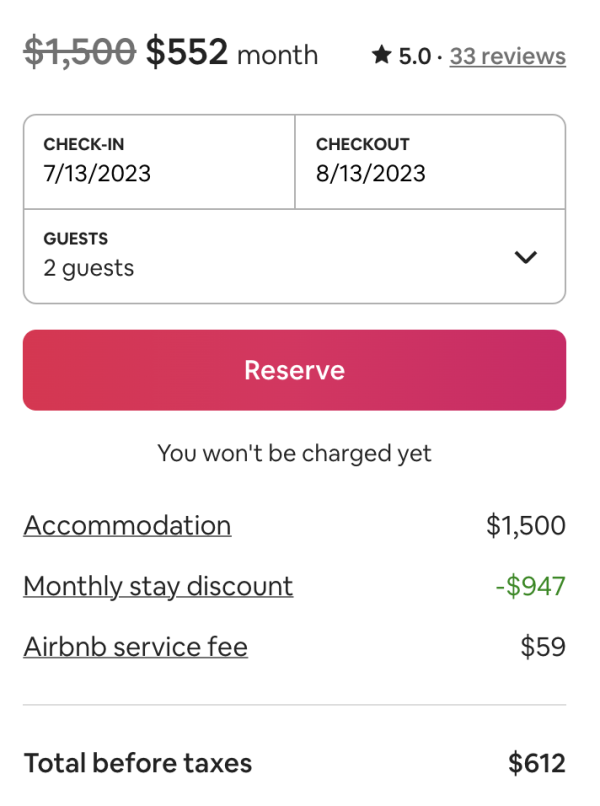 However, by extending the stay to 31 nights instead, the price drops to $612, which makes a huge difference for your budget.