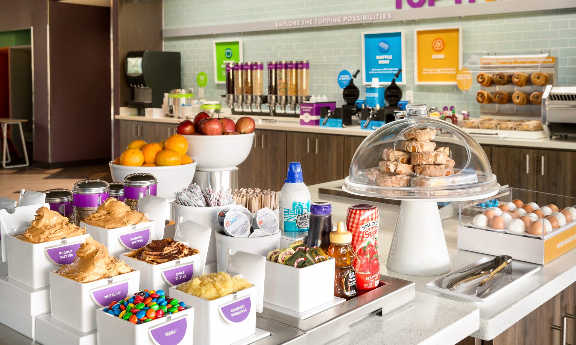 Tru by Hilton is Hilton's budget-friendly brand aimed at younger travelers, with a playful aesthetic and prices that typically are significantly cheaper than Hampton or Home2 Suites. The breakfast reflects this vibe: it's called the "Top It Breakfast Bar" and centers around an automatic pancake maker where you can load up toppings.