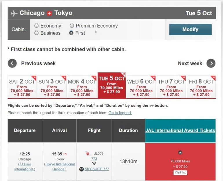 Finding a first class award ticket might not be easy. In many cases, Japan Airlines allows you to get on a waitlist, but it may or may not clear by the time you fly.