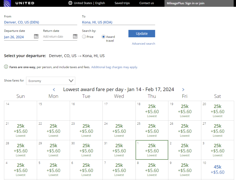 For example, Denver to Kona often prices no lower than 25,000 MileagePlus miles for economy.