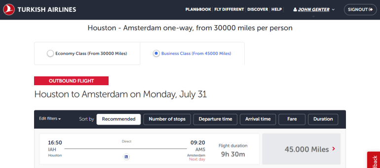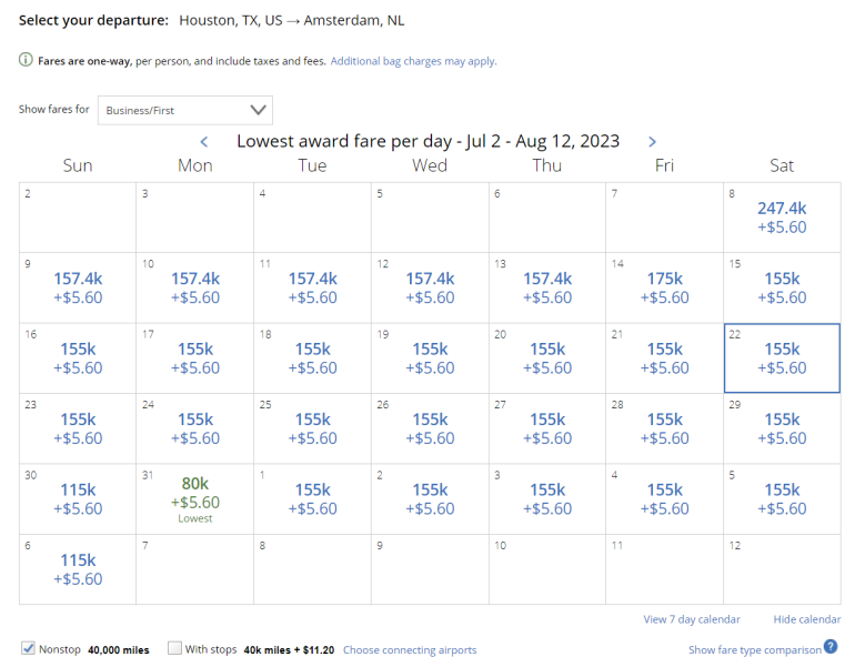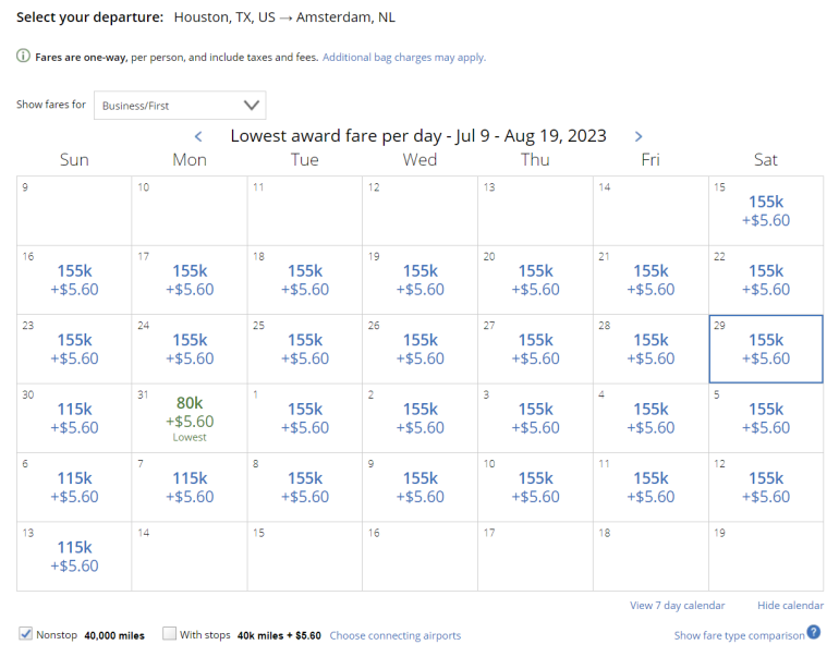 If you need to fly further, itineraries covering up to 6,000 miles in distance cost 70,000 Aeroplan points. That means you can fly from Houston to Amsterdam for 70,000 Aeroplan points instead of 80,000 United miles.