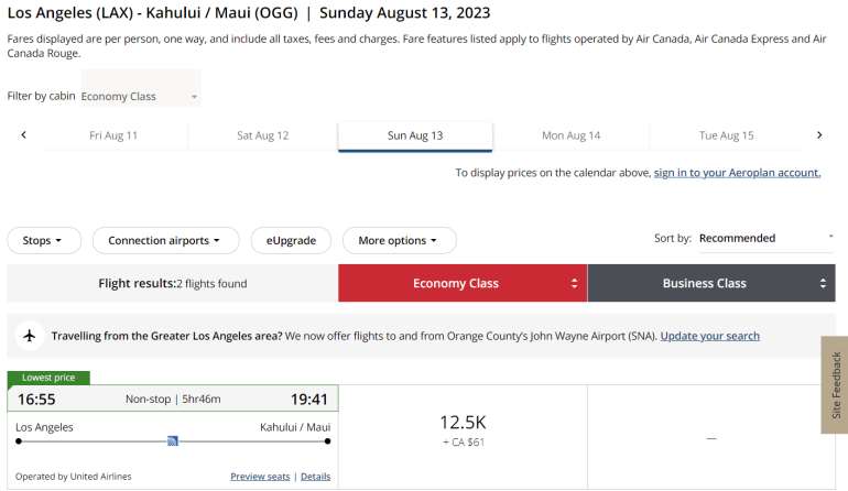 Air Canada Aeroplan can also be an appealing option for booking United award flights between the U.S. West Coast and Hawaii. For partner awards, Air Canada Aeroplan charges 12,500 points for economy flights from 1,501 to 2,750 miles each direction.