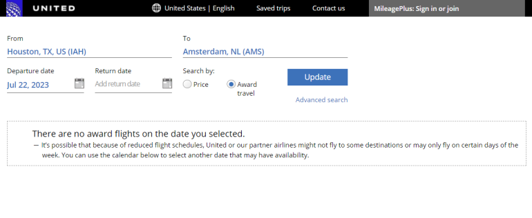 United doesn't seem to want travelers to know about this trick. So it will initially return an error that "there are no award flights on the date you selected." That's incorrect. Ignore the error and simply click the "update" button to see award search results.