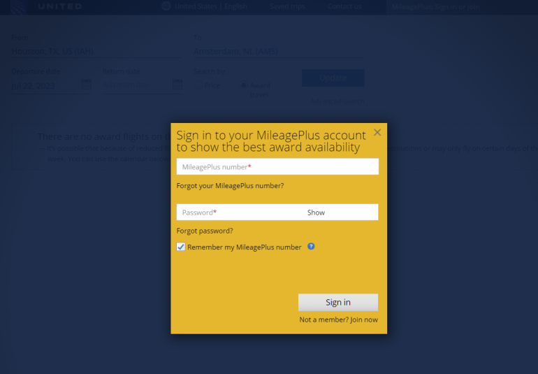 First, make sure that you're logged out of your United MileagePlus account. United Premier elite status members and United co-branded cardholders have access to additional saver award space. That extra award space is great when you're booking an award using MileagePlus miles, but this additional saver award isn't available when booking through partners.
