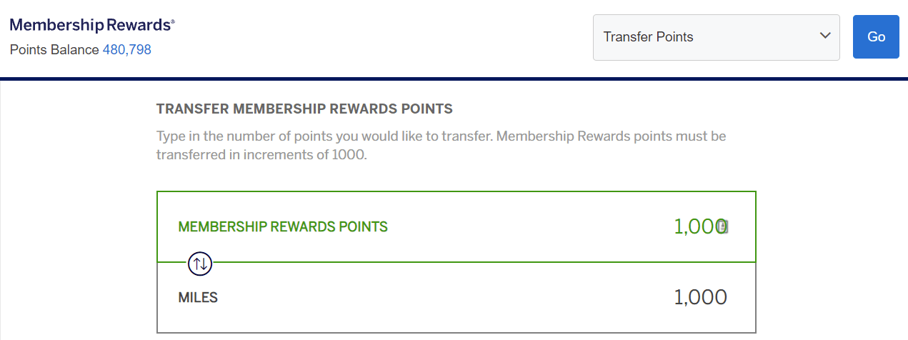 Next, enter the number of points you want to transfer or the number of miles you wish to receive. Just note that transfers must be in increments of 1,000 points.