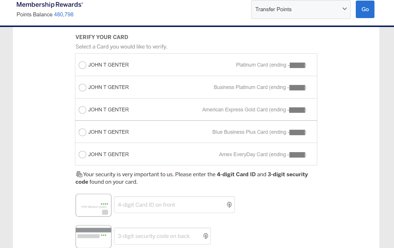 Then, you'll need to verify your AmEx card. Again, you can use any card that's linked to this AmEx account login. Select the card you want to verify from the list, enter the four-digit code on the front and the three-digit code on the back of the card.