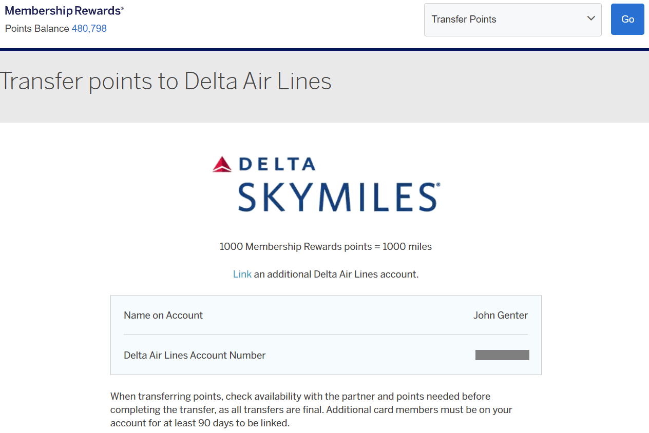 On the next screen, confirm that you're transferring points to the correct card member. It also can't hurt to double-check that the loyalty program account number is accurate.