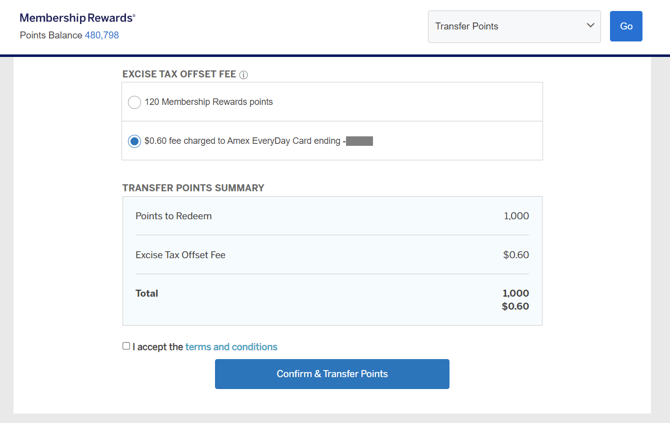 For transfers to U.S. airline programs, you'll need to pay an "excise tax offset fee" before you can transfer points. AmEx charges a fee of $0.0006 per point up to a maximum fee of $99. You can use Membership Rewards points to cover this fee. However, you'll only get half a cent per point in value, and there are much more valuable uses of Membership Rewards points.