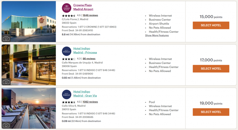 For example, book a Crowne Plaza by the Madrid airport for 15,000 points per night or a Hotel Indigo near the city for 17,000 points per night.