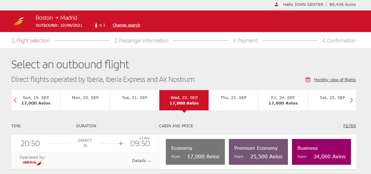 Travelers can save more by flying during off-peak dates. For instance, you could pay just 17,000 Avios each way in economy or 25,500 Avios each way in premium economy for flights between Boston and Madrid.