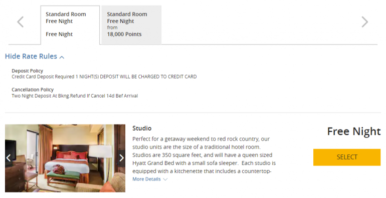 The description of the available room for the Hyatt free night certificate appears next. You may also compare available rooms and how much they cost in cash or points by checking other rates. Click "Select" if you are ready to book your room.