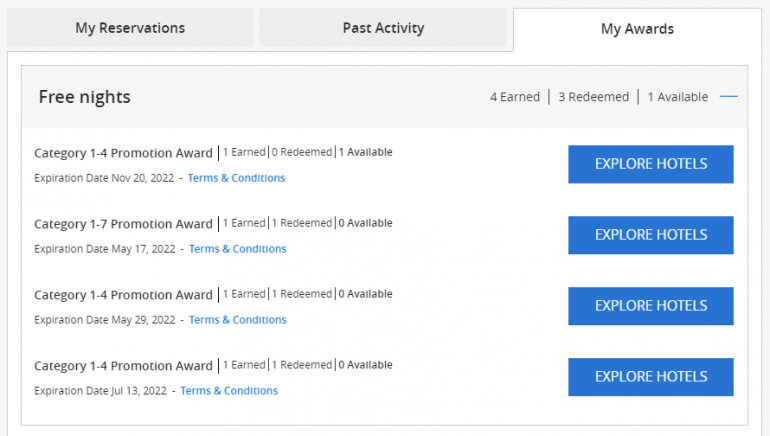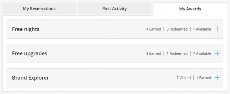 After clicking on "My Awards," you'll find a summary of your free nights, upgrades and Brand Explorer progress.