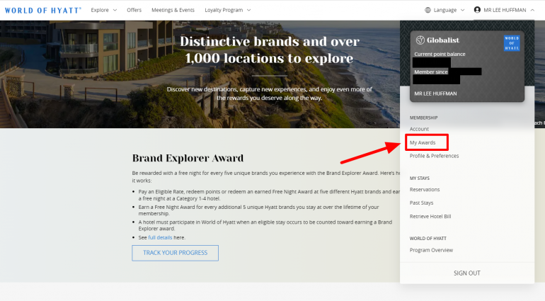 Using your internet browser, visit Hyatt.com and log into your account. Click on your name in the upper right corner, then click on "My Awards."