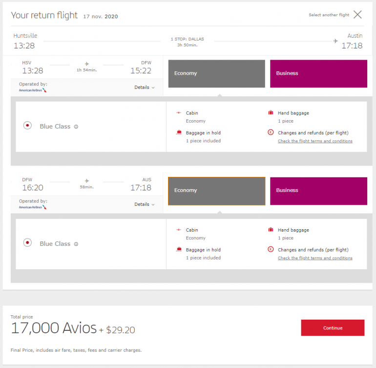 For example, a trip from Huntsville, Texas, to Austin via Dallas-Fort Worth used to cost 17,000 Iberia Avios round-trip: