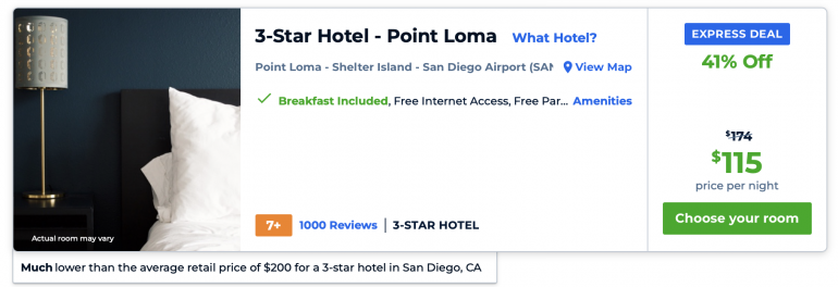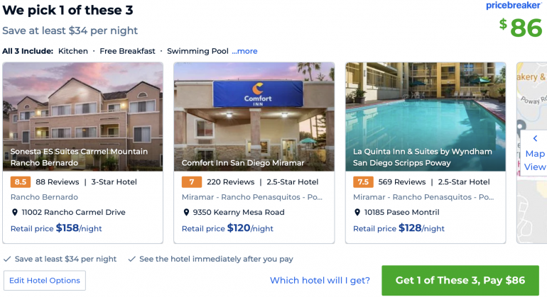 The other way Priceline can save you money is through Pricebreakers. These deals will allow you to pay a discounted price for one of three separate hotels. You won’t know which of the three you’ll get until your booking is completed, but you’ll still be saving money overall.