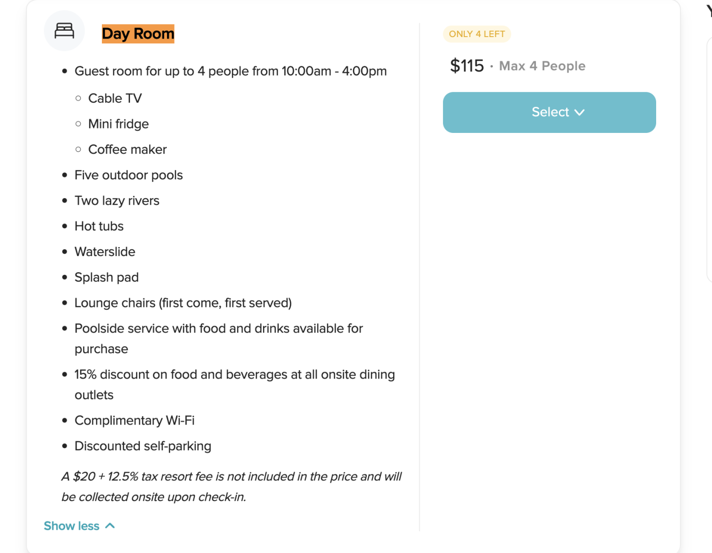 The hours during which you can use it are limited to 10 a.m. to 4 p.m., but you do have access to all of the property’s pools, lazy rivers and outdoor amenities, plus you get a room to lounge in and somewhere to shower.