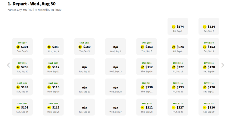 For example, if you look for flights from Kansas City to Nashville, you will find that the airline can’t get you between those two cities on Tuesday or Wednesday. If your Monday flight to Nashville cancels, you’ll most likely be waiting until Thursday to be rebooked, if space is available at all.