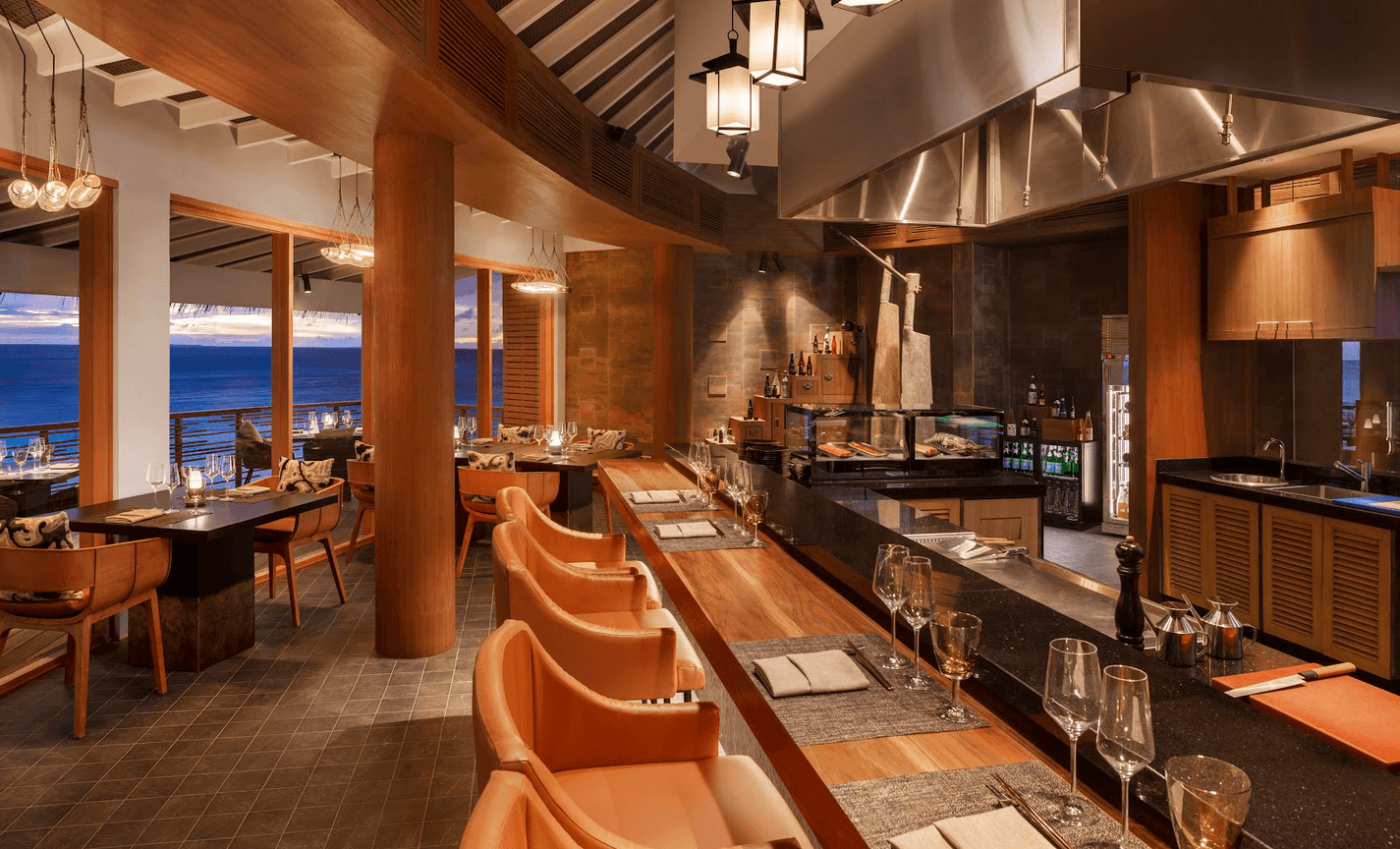 Sharing the same building are Japanese restaurants featuring a teppanyaki table and a steakhouse. Here, guests can start with a sunset cocktail from the al fresco bar before choosing between the two menus. At Hashi, the menu includes fresh sushi, teppanyaki meals prepared in front of you, and a wide range of other specialties paired with a long list of whiskey, sake and Japanese teas.