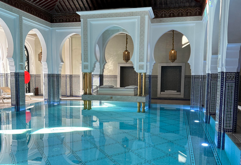 It featured dramatic archways, zellige tiles, historic photographs and beautifully ornate ceiling cornices. A cushioned headboard fronted the unbelievably soft bedding covered in Maison Porthault linens.