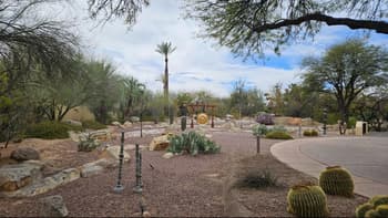 Everything is serene with desert vegetation and construction.