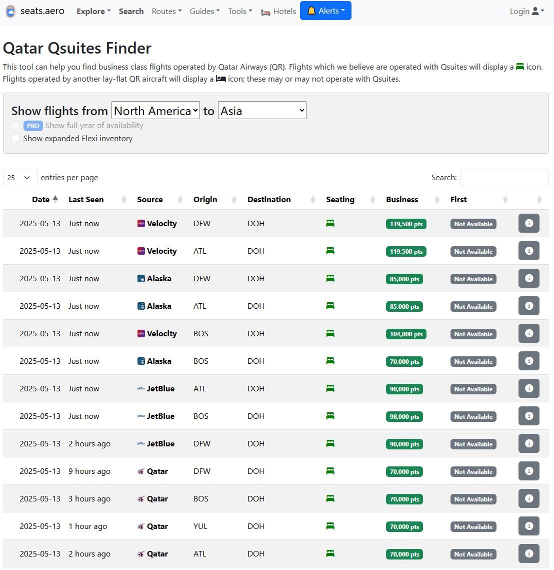 Search results for Qatar Airways QSuites on Seats.aero.