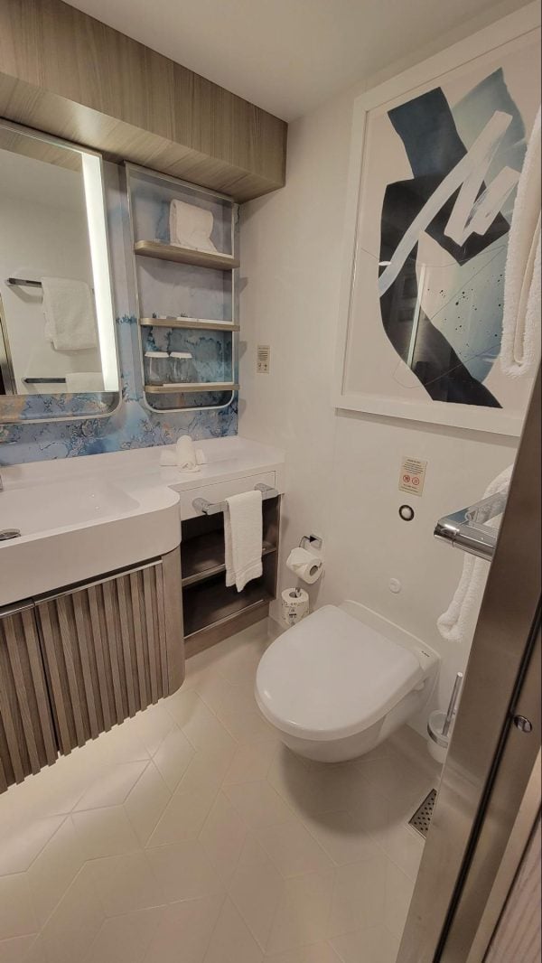 The cabin seemed very spacious because the bed was by the balcony, which left a big open space in the cabin. While this was nice, anyone sleeping next to the balcony would have a difficult time getting out of bed without hitting the sliding glass door or the bed.