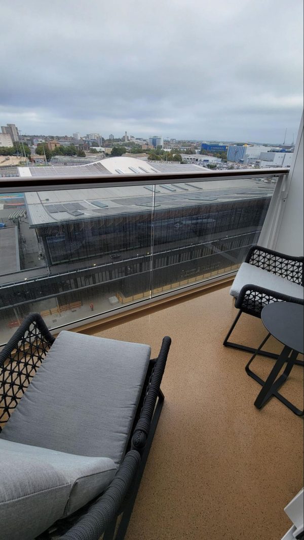 The balcony had two comfortable chairs and a small table.
