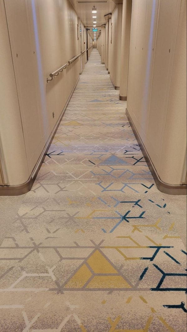 NCL loyalists know the carpets on other ships have fish, which are always swimming forward. On the Prima, triangles replace the fish to help orient passengers.
