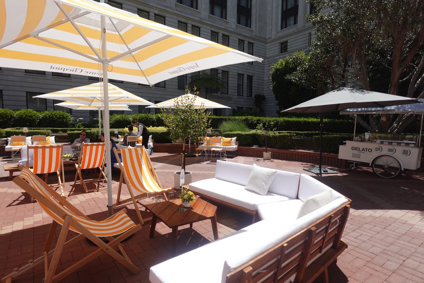 As far as the hotel itself is popular with San Francisco tourists and locals alike thanks to its signature restaurant, The Lounge. In summer, it becomes especially lively. That's due to the annual Solaire Terrasse pop-up, held in collaboration with Veuve Clicquot. Upon entry, diners sink into plush chairs. Assuming San Francisco's iconic fog isn't in the picture, then yellow and white umbrellas provide critical shade. Refreshments include champagne, nosh lobster, caviar and a Veuve Clicquot-inspired zero proof sorbet which was created exclusively for The Ritz-Carlton, San Francisco.