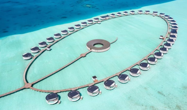 The Ritz-Carlton Maldives, Fari Islands uses modern architecture to wow its guests. There are no thatch-roofed overwater bungalows, as traditionally found in the Maldives.