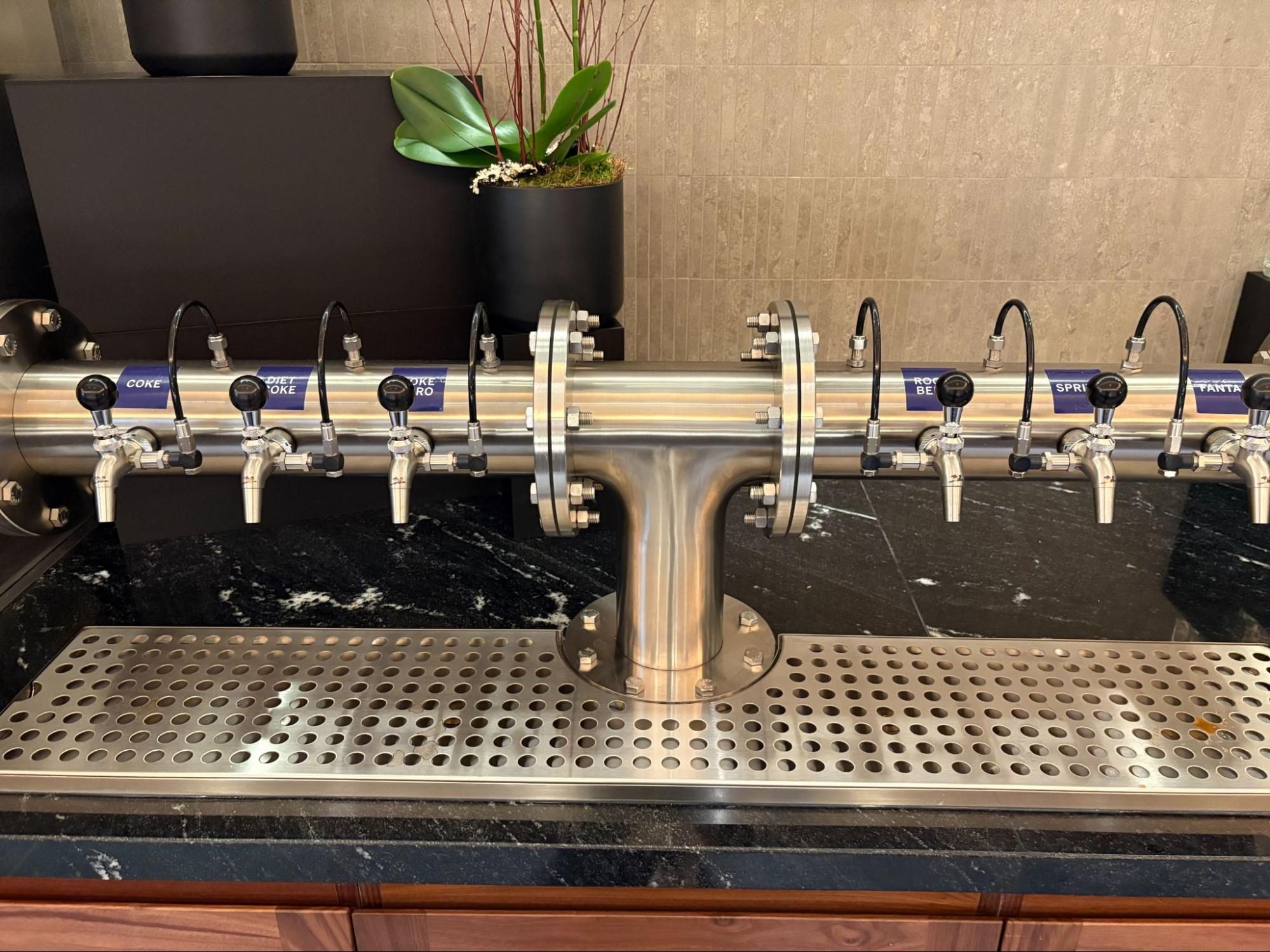 Next to the buffet is a beverage station, including a tap-like soda dispenser. There are also flavored syrups and other ingredients nearby to make your own “dirty soda.”