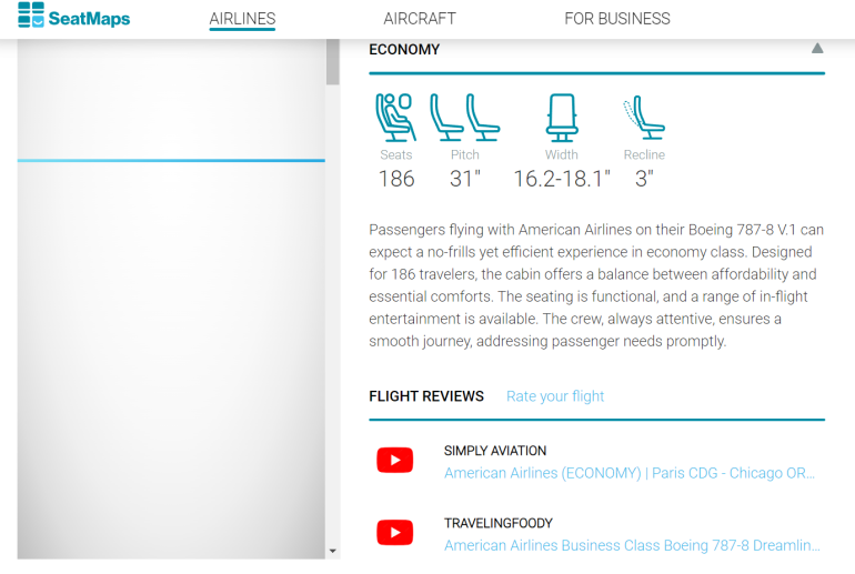 In addition to curated content, SeatMaps also accepts user-submitted content and links to video reviews of aircraft from trusted YouTube reviewers like Simply Aviation.