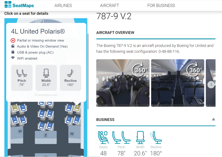 Like SeatGuru, SeatMaps provides a detailed color-coded seat map with details such as the number of seats in each cabin, seat pitch, seat width and even how much the seat reclines. SeatMaps also has 360-degree photos for some aircraft types.