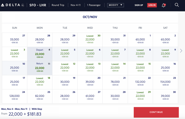 Delta’s price calendar is a great tool to determine the lowest redemption rates year-round. It’s definitely a good idea to book in advance — having a nice stash of Delta SkyMiles on hand helps. Currently, the Delta SkyMiles credit cards are offering higher welcome bonuses. With these increased welcome bonuses, you can book at least two round-trip tickets between San Francisco and London — assuming you get in on the 22,000-mile redemption rate.