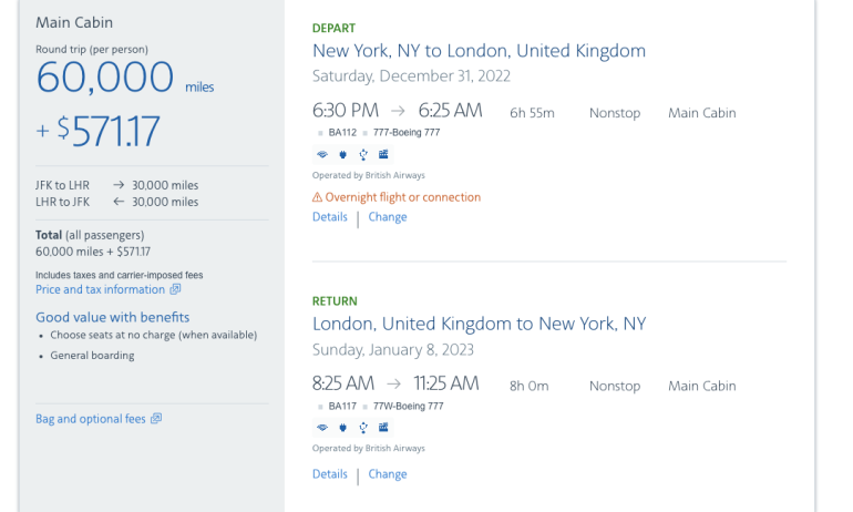 However, that's often not the case when booking flights via American transfer partners. Here's an example when you book British Airways awards through American AAdvantage that shows how taxes and surcharges on these awards are through the roof. The example below shows American’s 60,000-mile round-trip award pricing, but when it comes with nearly $600 in fees, the value changes significantly.