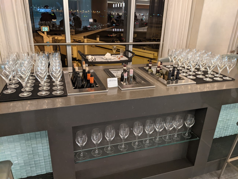 The latter are impressive lounges with large buffets offering sushi, soups and salads. Self-serve bars offer a wide range of cocktails, wines, beers and champagne while refrigerators stock bottled water, juices and sodas.