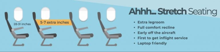 - “Stretch seating” offers more legroom, but costs more.