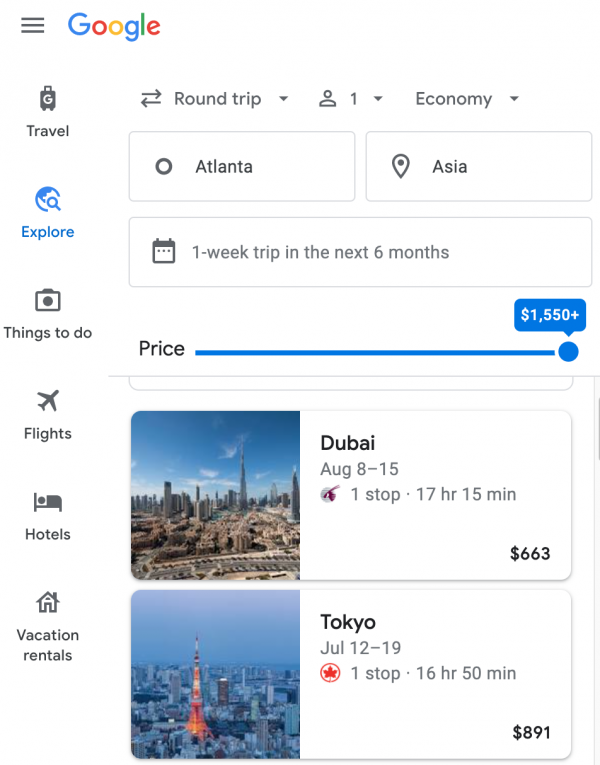 To use the tool, enter your departure city, the length of trip you’re looking for and your price range, and Google returns a handful of great deals to a bunch of destinations at random times within your date range.