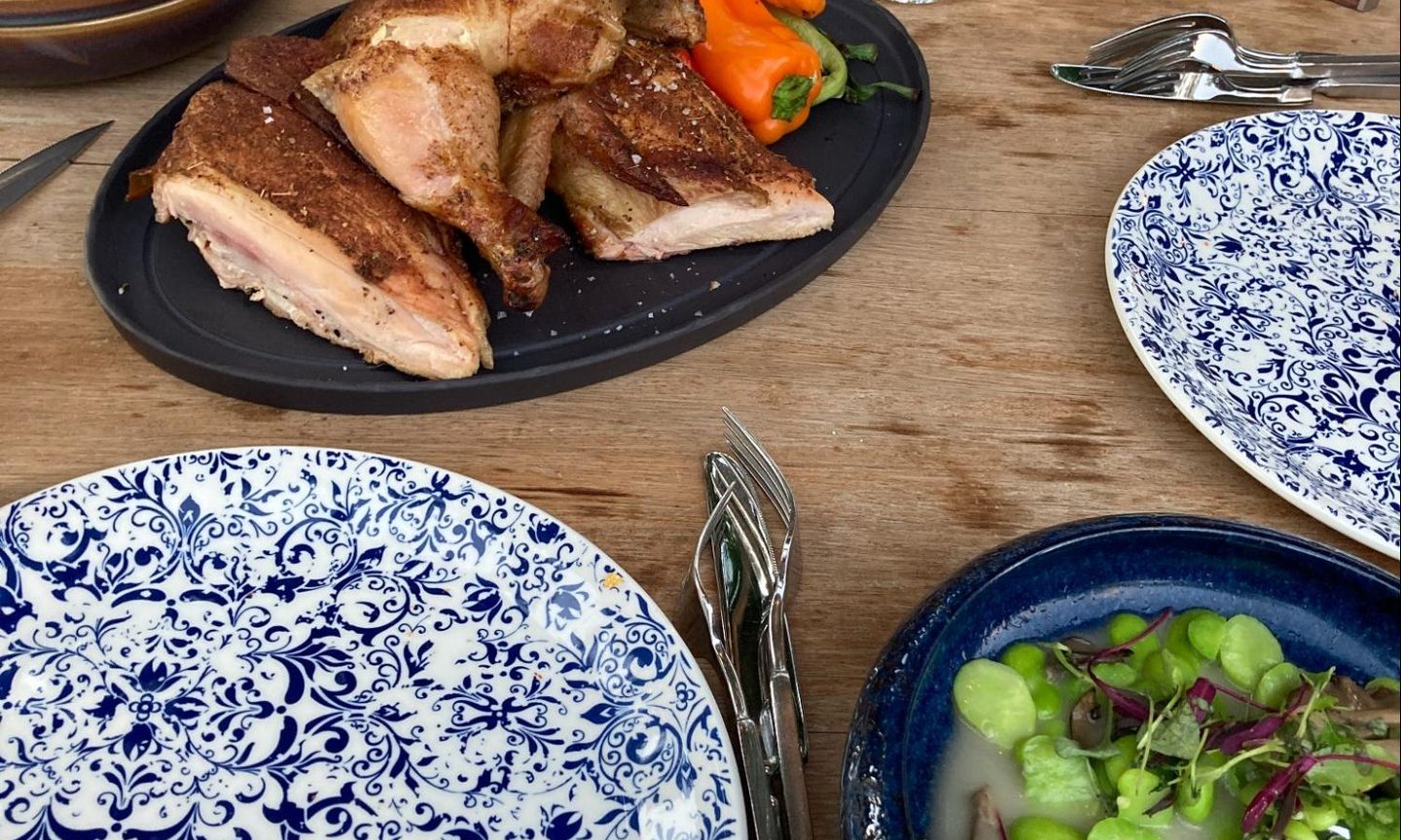 The $55 mesquite-smoked chicken is enough to feed at least three, and is served with salsa and tortillas to make DIY tacos. We also ordered a $10 side of fava beans.