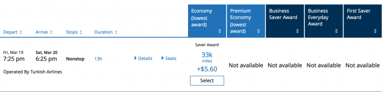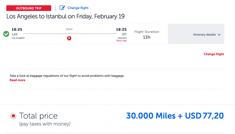 The same Turkish Airlines flight costs 30,000 Turkish Miles&Smiles miles, but the taxes and fees are $77.20 (compared with $5.60 for United). If you don’t have Turkish Airlines miles, you can transfer Citi ThankYou Rewards points to Turkish Miles&Smiles at a 1:1 ratio.