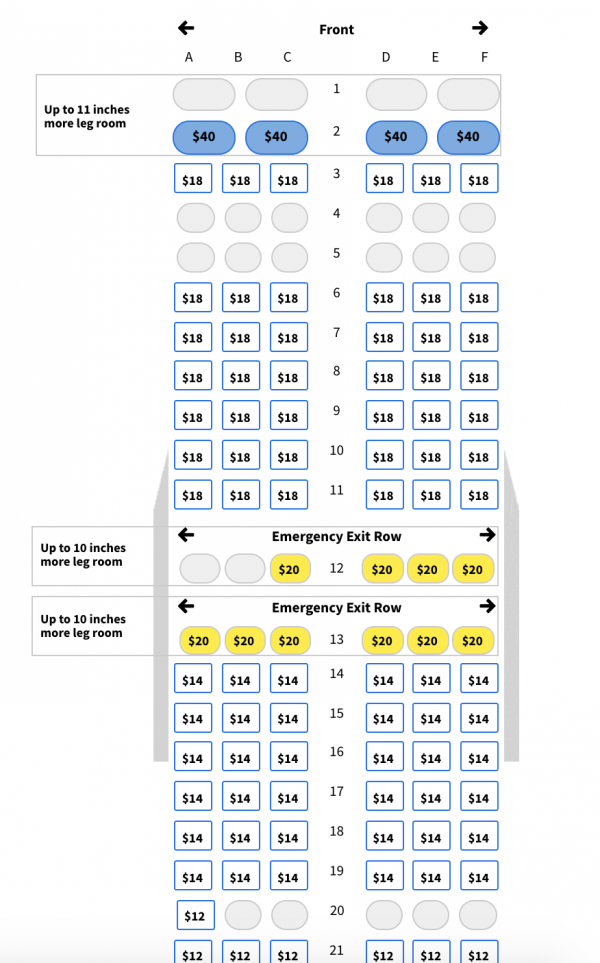 The "Big Front Seats" have more legroom, are wider (no middle seat in the row) and cost an additional $40. The often-coveted seats in the emergency exit rows cost $20, and even a middle seat near the back costs $12 to reserve.