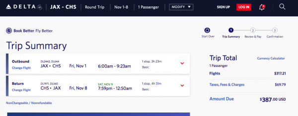 For example, let’s say you want to travel from Jacksonville, Florida to Charleston, South Carolina, for a weekend full of Southern charm. We found a round-trip ticket on Delta that costs $387, including taxes and fees.