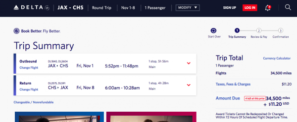 Or, you could spend 34,500 miles plus $11.20 in taxes and fees for the same travel dates, also on Delta.