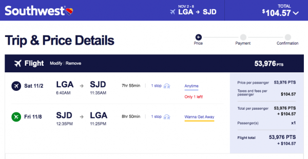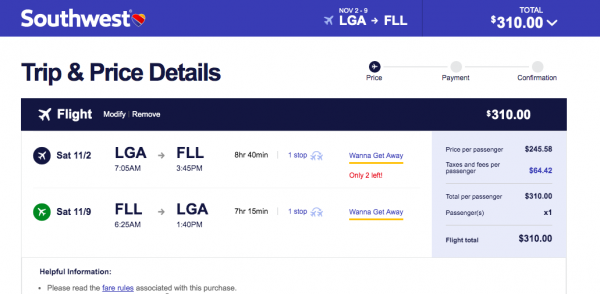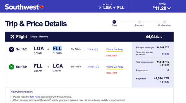 Here’s an example. Let’s say you’re craving a little sunshine before the holiday season kicks off. You could fly this itinerary on Southwest from New York City’s LaGuardia airport to Fort Lauderdale, Florida for a week of sun, sand and surf for around 44,000 miles plus $11.20 in taxes and fees.